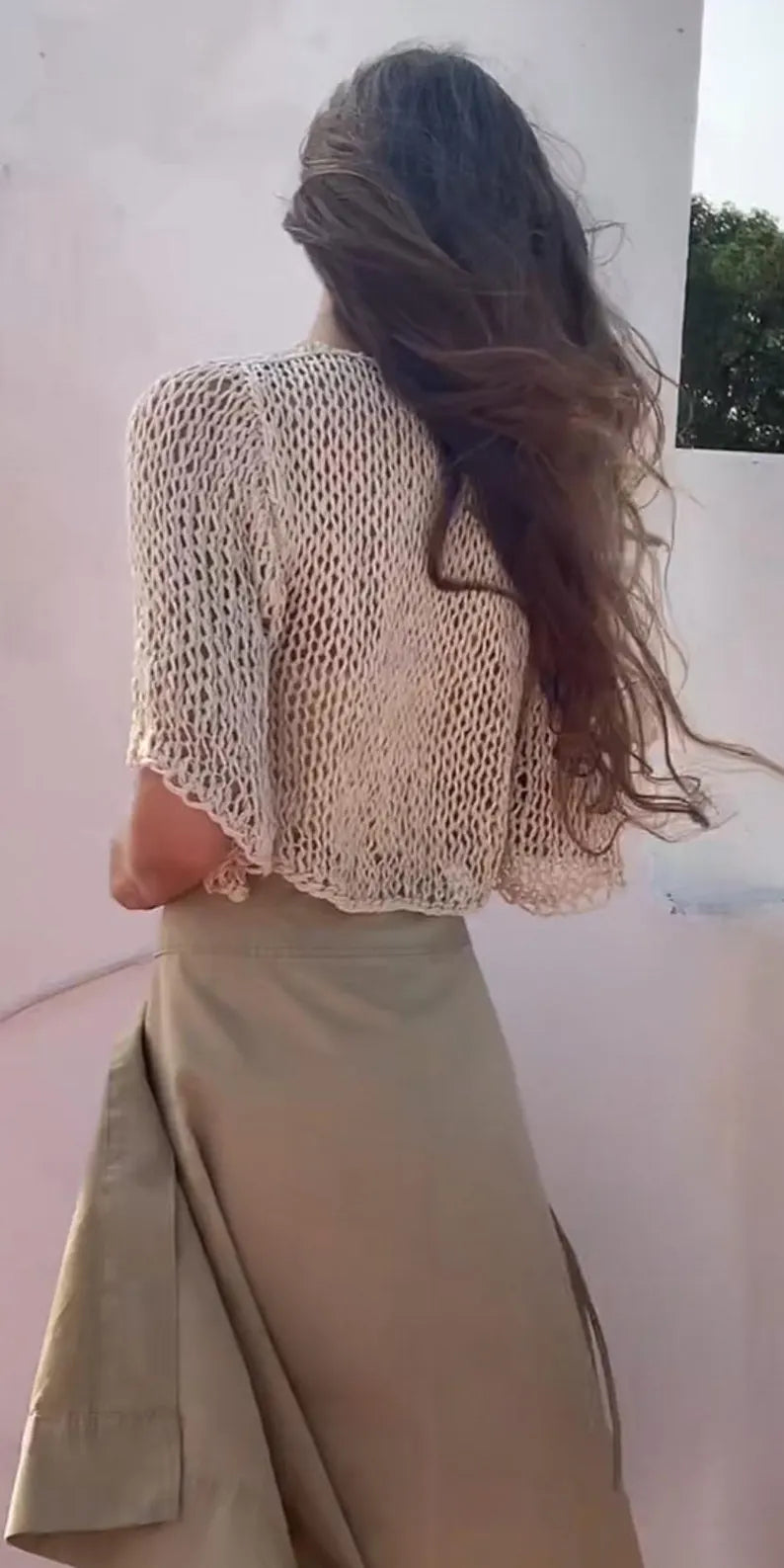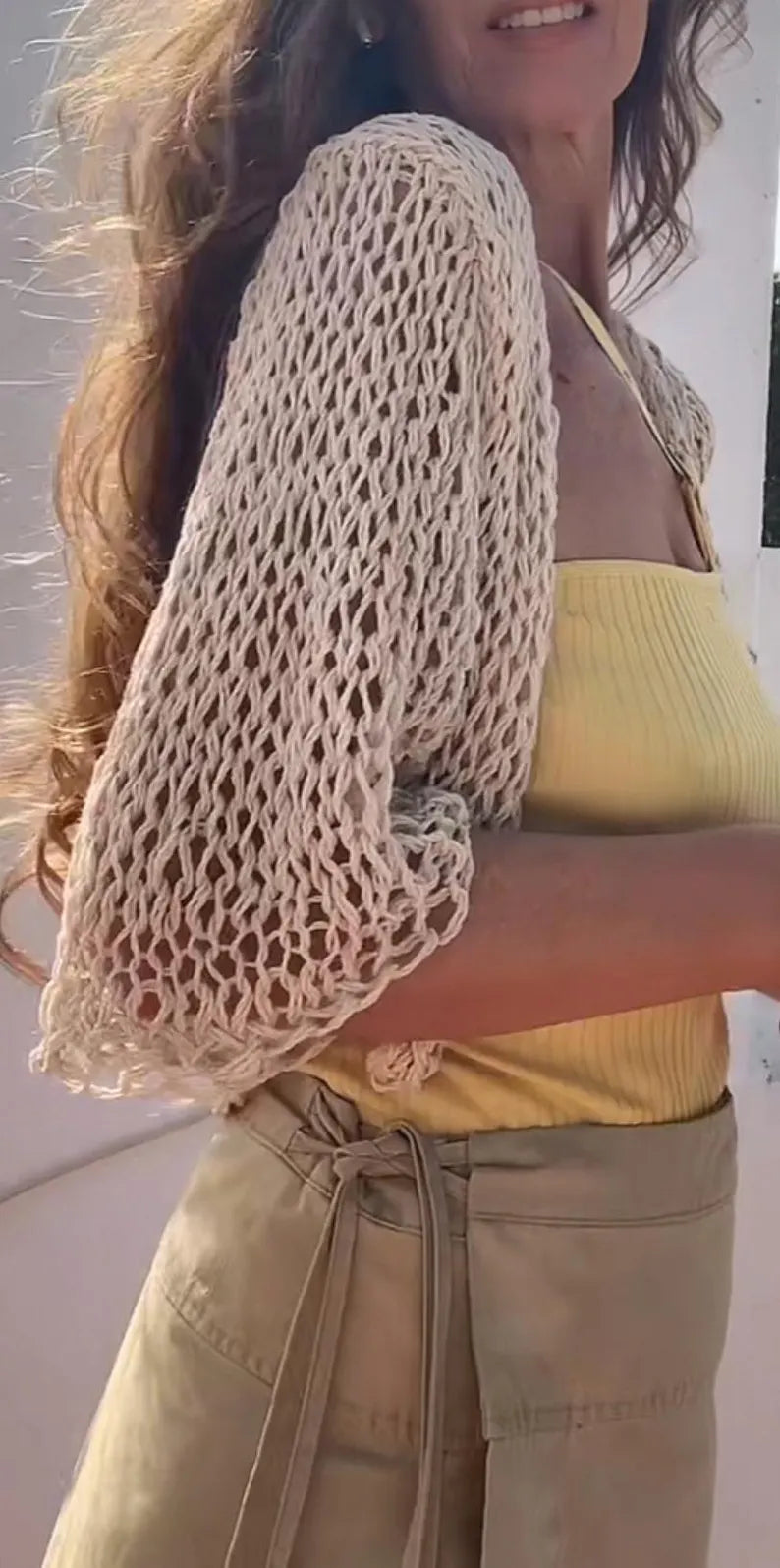 A perfect little throw on for the warm weather days, I've created this effortless bolero style cardi from a linen cotton blend yarn, the drape is luxurious, with fairly wide elbow length sleeves,