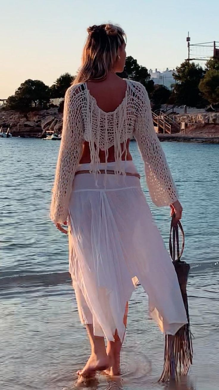 Ivory white crop sweater, fringe details on the back, micro crop backless croptop